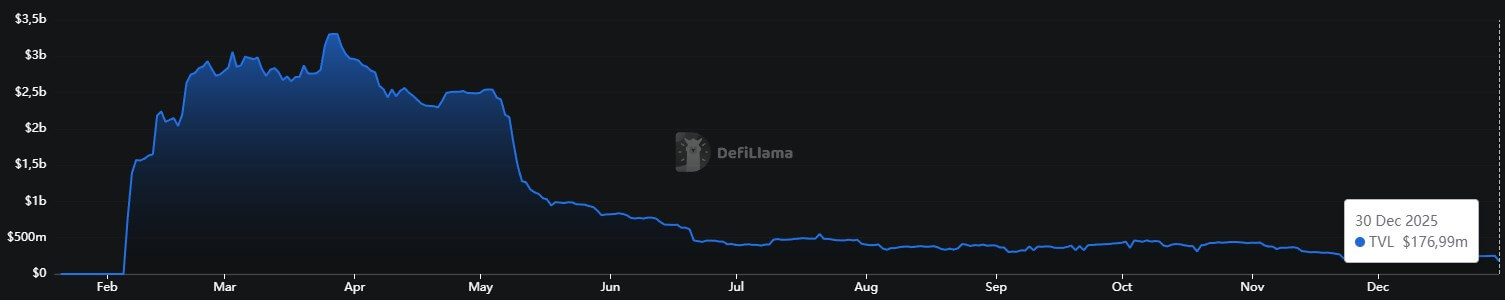 Yet, DeFiLlama now shows the TVL at roughly $177 million, a drawdown exceeding 90%.