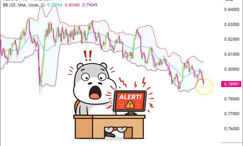 - Whether NZD/CAD quickly reclaims and closes back inside the lower band, suggesting a possible exhaustion spike rather than a new leg down.