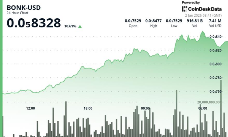 BONK climbed in the past 24 hours, rising roughly 10.6% to around $0.00000833 as the token advanced through a key technical threshold.