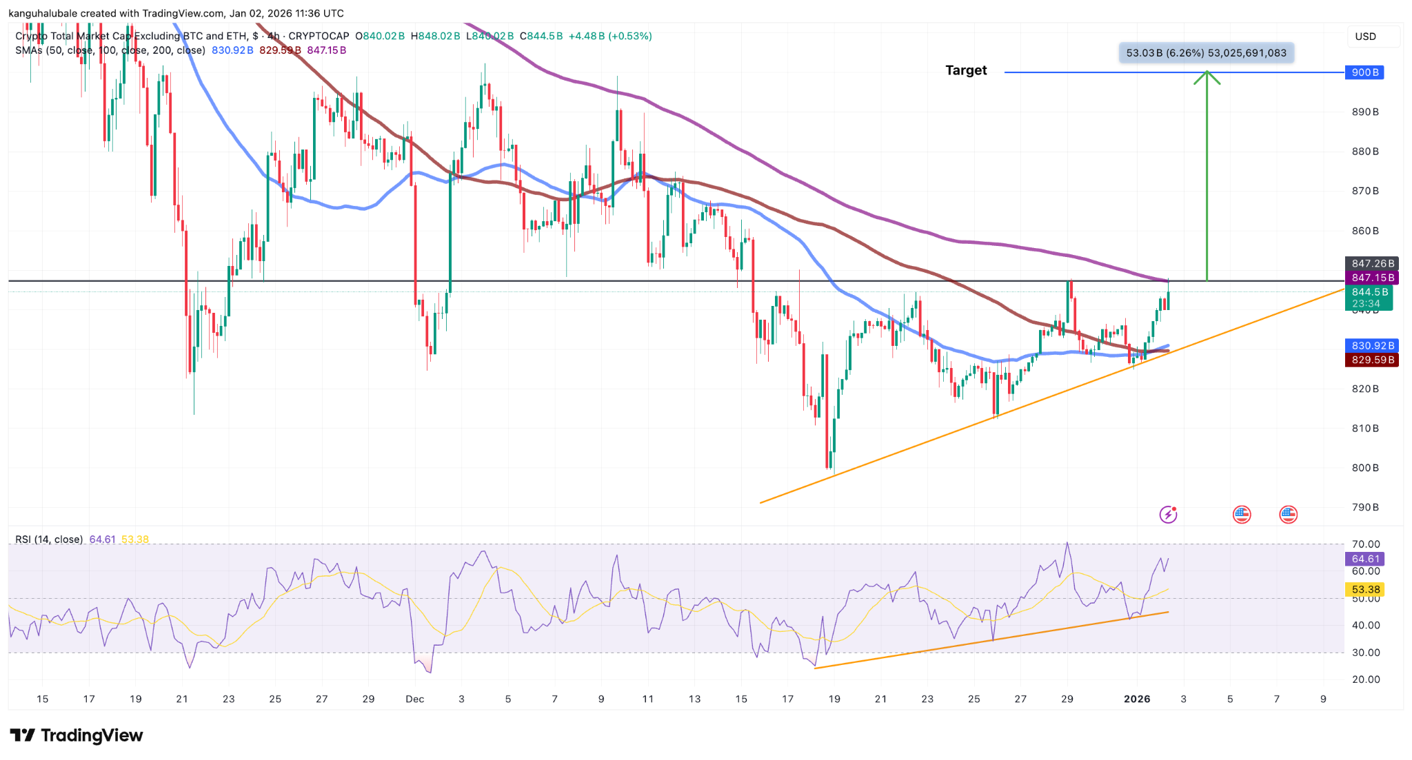 The current bullishness in memecoin prices is preceded by a strong technical structure by TOTAL3, or the total market cap of all cryptocurrencies excluding Bitcoin (BTC) and Ether (ETH), which has experienced a significant rise over the last two days.