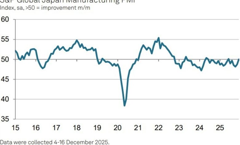 The headline Japan Manufacturing PMI rose to 50.0 in December from 48.7 in November, marking the first reading at the neutral threshold in five months and ending a prolonged period of deterioration. The improvement was driven primarily by a much slower contraction in new business, which fell at its weakest pace in 19 months. Some manufacturers reported stronger-than-expected sales linked to new projects and improved customer spending.