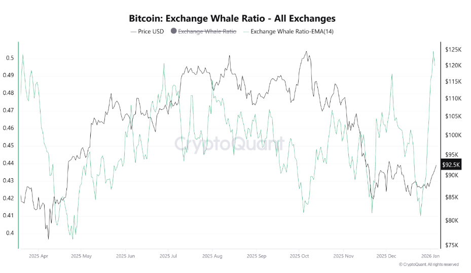 The two-week moving average of the exchange whale ratio indicator, which measures the proportion of inflows in the ten largest originating from whale entities, is now at its highest since March 2025.
