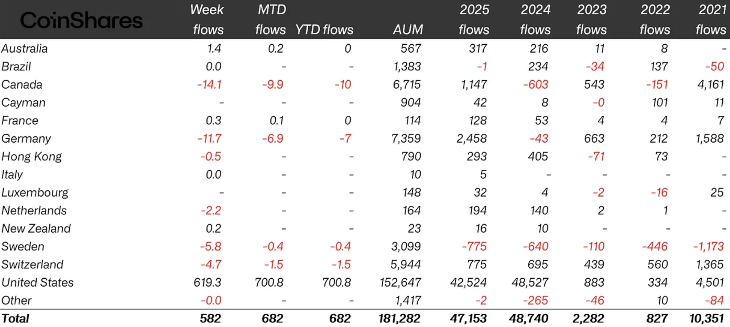 Meanwhile, Germany saw the strongest growth, with inflows jumping from just $43 million in 2024 to $2.5 billion last year. Canada also recorded a notable recovery, rising from $600 million in 2024 to $1.1 billion in 2025.