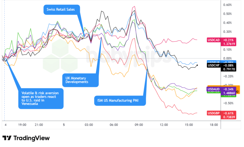 The US dollar started strong but then traded with a net bearish lean through the rest of the Monday’s session, closing lower against most major currencies in a pattern that defied typical safe-haven dynamics following the weekend’s Venezuela operation. The subdued dollar response appeared to signal market confidence that geopolitical tensions would remain contained, while traders positioned ahead of this week’s more consequential economic releases.