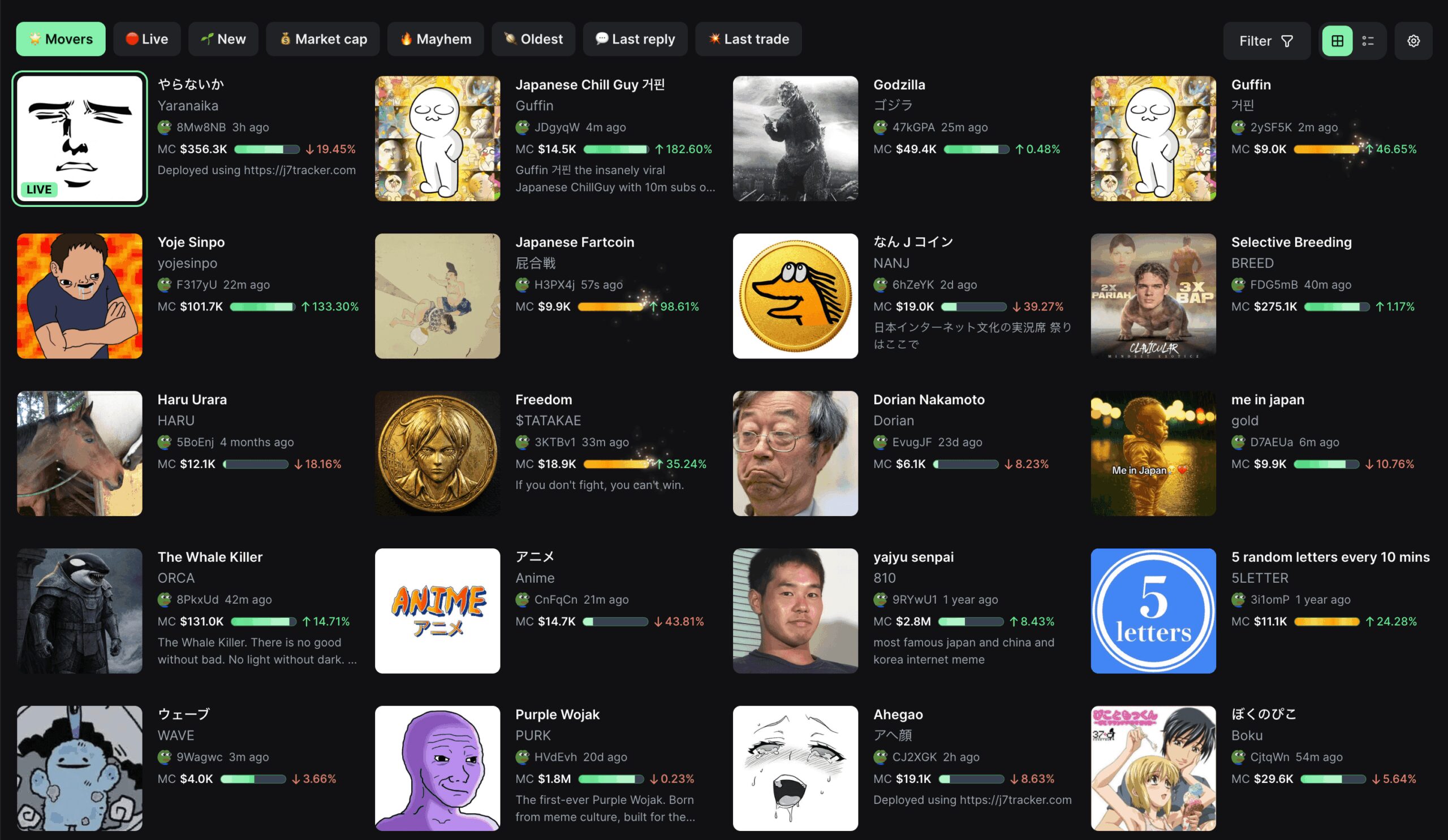 Japan-focused and anime-based tokens seemed to be the flavor for new token issuances in Asian afternoon hours on Tuesday, though these themes can rapidly change based on newer narratives or demographics of users most using the platform at any given time.