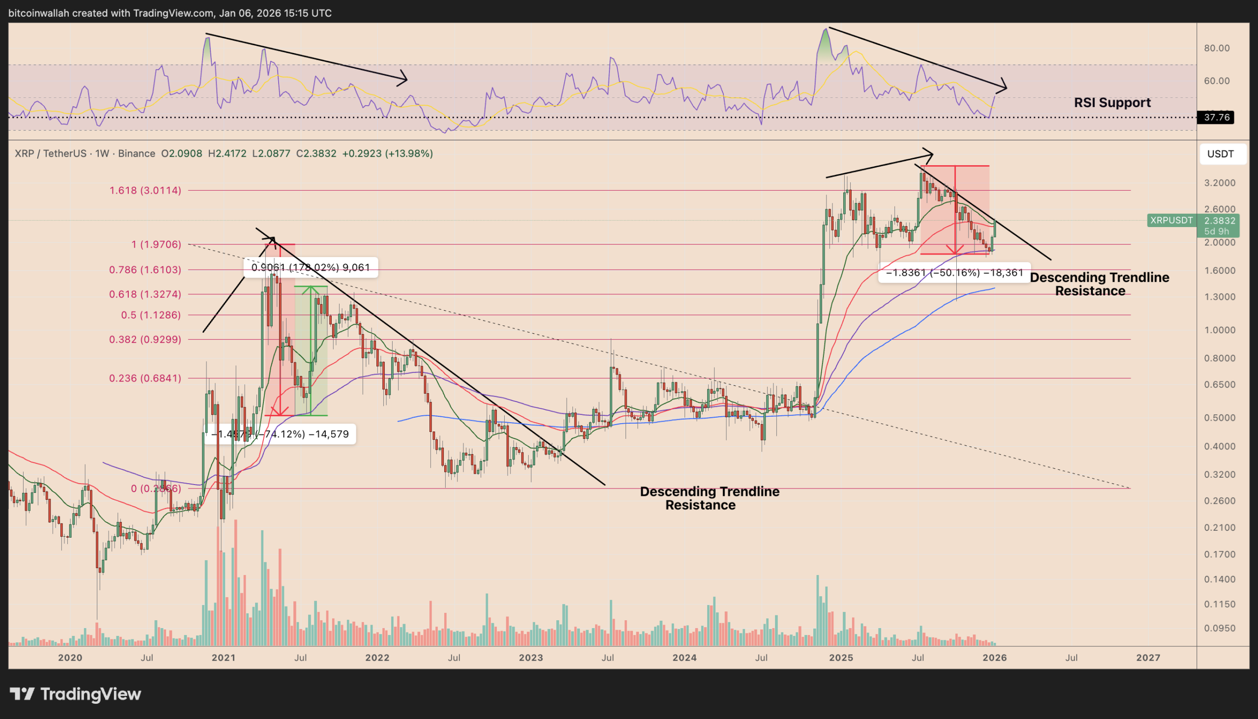 During that downtrend, XRP saw sharp countertrend rallies, often after testing the 100-week exponential moving average (EMA), with some rebounds exceeding 100% gains.