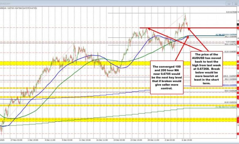 Currently, the pair is testing highs from last week near 0.67268, a level that now acts as an important short-term pivot. A sustained break below that area would tilt the near-term bias more decisively to the downside, shifting trader attention toward the converged 100- and 200-hour moving averages near 0.6705. A move down to—and especially through—that moving-average cluster would be technically significant, as it would give sellers greater control and signal that the post-PPI rebound has likely run its course (see the blue and green lines on the chart).