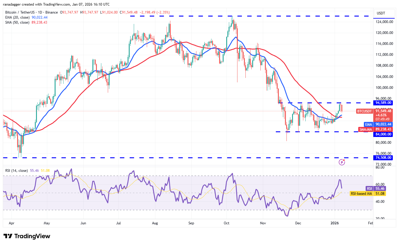 The pullback is expected to find support at the 20-day exponential moving average ($90,022). If the Bitcoin price rebounds off the 20-day EMA with force, it increases the possibility of a break above the $94,589 resistance. The BTC/USDT pair may then ascend to the psychological level of $100,000 and subsequently to $107,500.