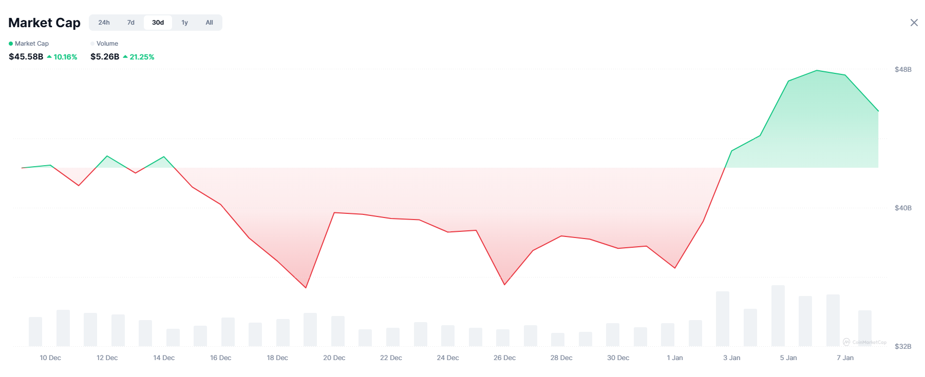 The memecoin market cap has since rebounded, crossing $47.7 billion on Monday, up from $38 billion on Dec. 29, according CoinMarketCap. As of Thursday, it has settled around $45 billion.