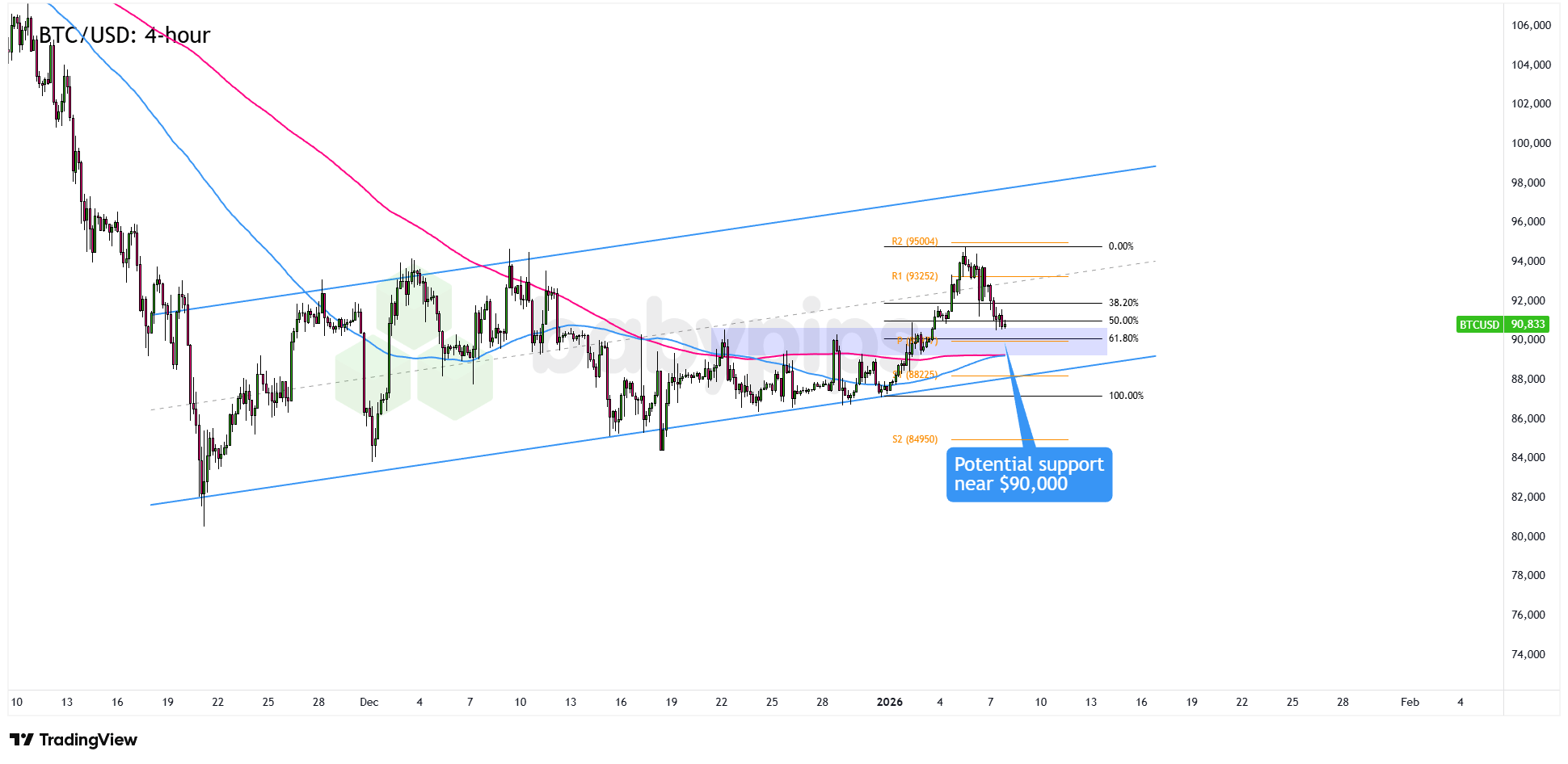 What makes this area stand out is how close price is to the $90,000 handle, which lines up with the Pivot Point and the 61.8% Fibonacci retracement of the 2026 upswing.