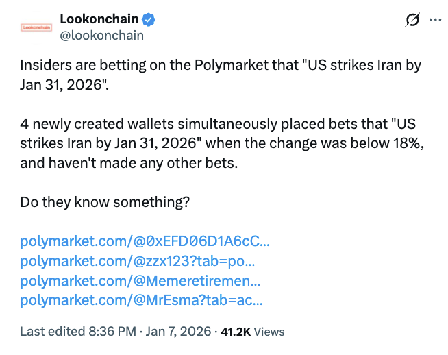 The news comes as a separate trader with an account boasting a reported 100% win rate placed bet on the US striking Iran by the end of January on Polymarket, further fueling scrutiny of insider activity among industry observers.