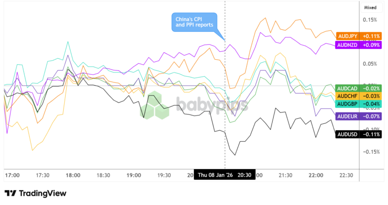 The Australian dollar showed limited immediate reaction to the Chinese inflation data, with currency movements appearing relatively muted across major pairs in the immediate aftermath of the release.