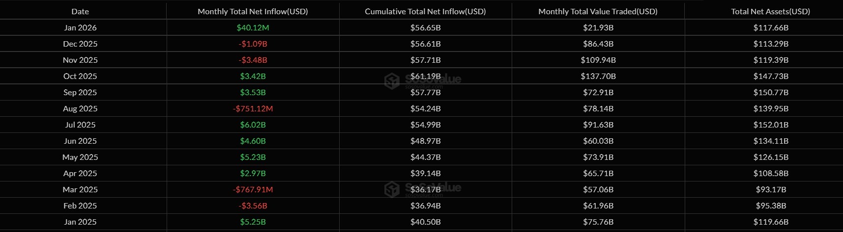 By contrast, spot ETFs tracking altcoins like XRP (XRP) and Solana (SOL) posted smaller monthly inflows but avoided outflow months. While inflow figures are significantly smaller, they consistently posted inflows amid broader volatility from the major funds.