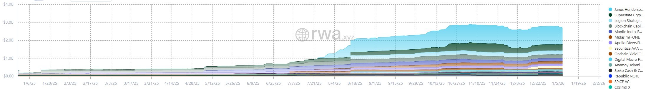 Tokenized institutional funds grew from near zero to $2.8 billion through 2025, led by Janus Henderson and Superstate products.