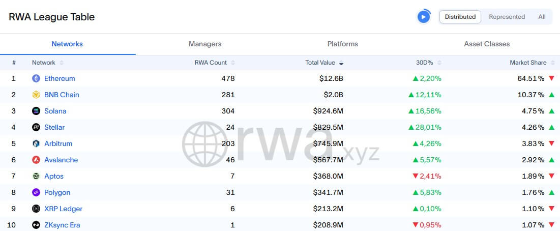 Ethereum dominates distributed RWAs with $12.6 billion (64.51% market share), while Stellar showed the fastest 30-day growth at 28%.