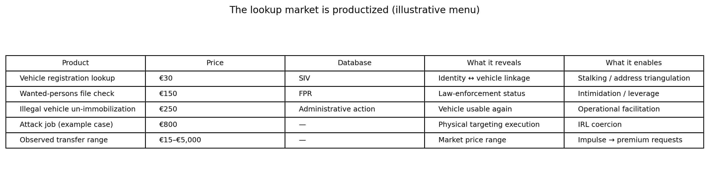 Database lookups are sold like commodities, with transparent pricing. The Snapchat price list of €30 for vehicle registration and €150 for wanted-persons checks shows the market is productized.