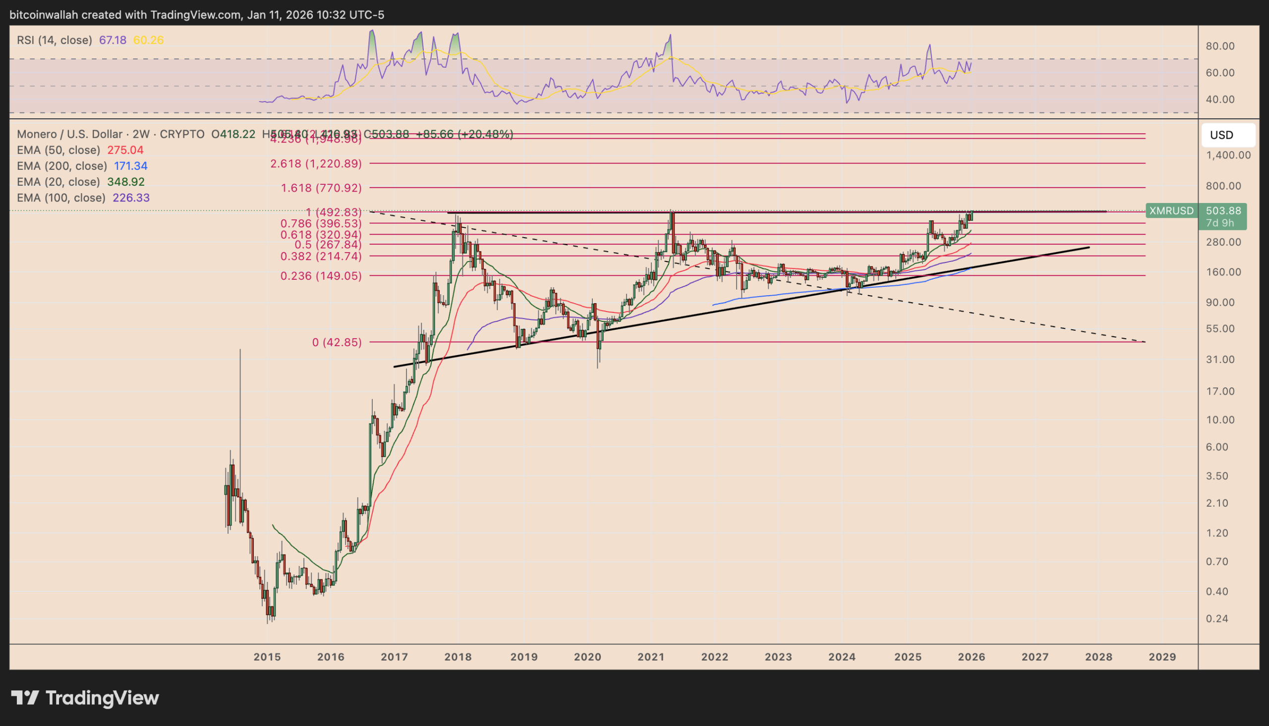 As of January, XMR was on the cusp of price discovery while eyeing a breakout above its record high of around $517.50.