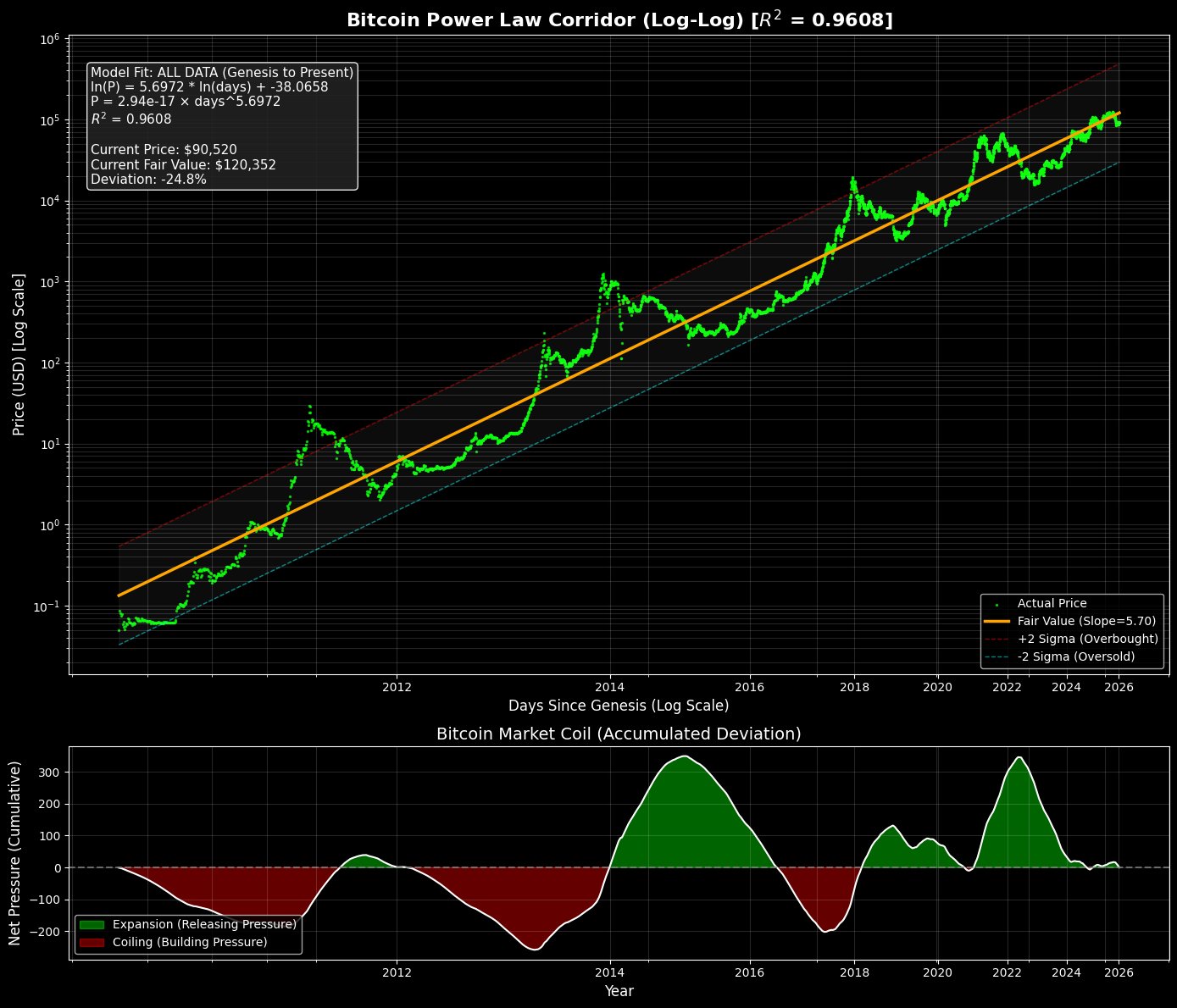 “Bitcoin is Compressed Below Its Growth Law, and Compression Always Resolves Upward,” he summarized on X.