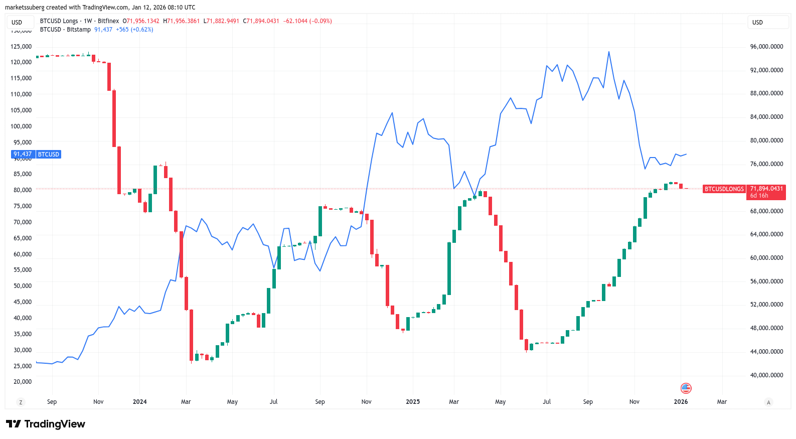 Bitfinex longs currently total around 71,800 BTC, marking their lowest levels since Dec. 15.