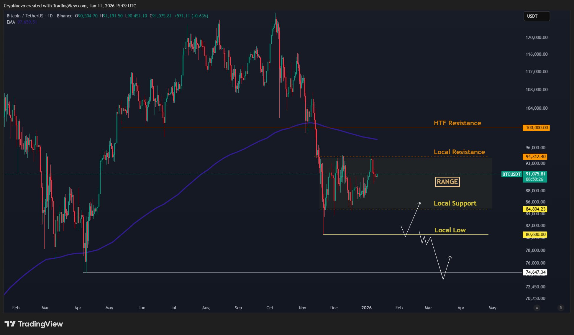 On higher time frames, trader CrypNuevo focused on the 50-week exponential moving average (EMA) at $97,400 as a potential upside target before new lows.