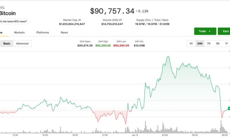 Bitcoin's early gains fade fast as prices fall back below $91,000