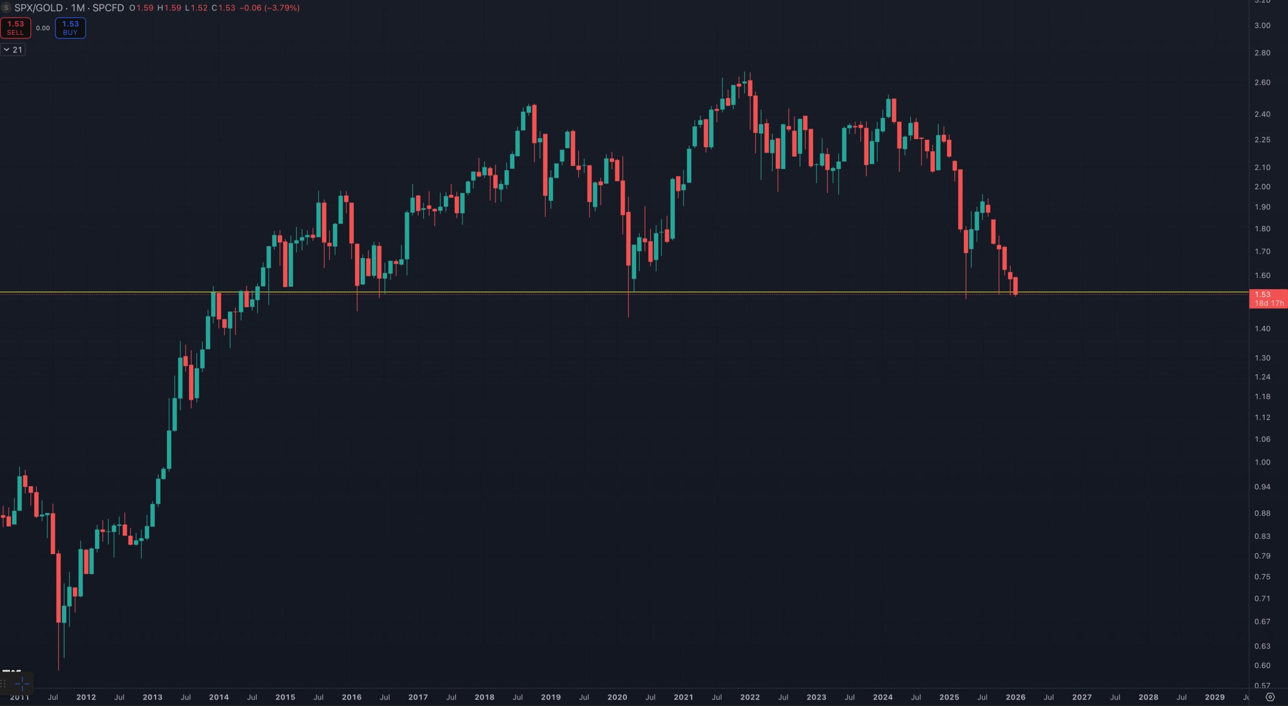 “If SPX breaks down against Gold, the environment we have found ourselves in for the last decade will completely change,” he argued about the monthly chart.