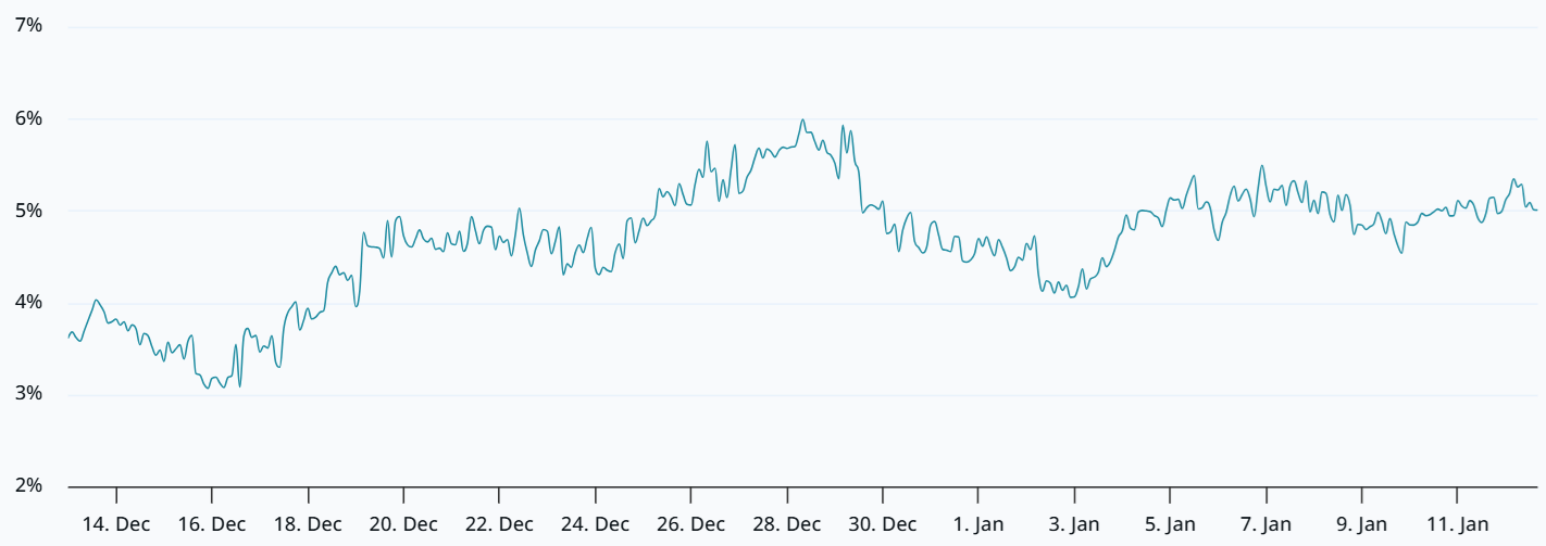 Bitcoin’s risk profile appears largely unchanged by the power struggle between the Fed and the Trump administration, as the BTC futures annualized premium, or basis rate, remained near a neutral-to-bearish 5%. Periods of bullish sentiment are typically characterized by BTC futures trading at a 10% premium or more relative to spot markets.