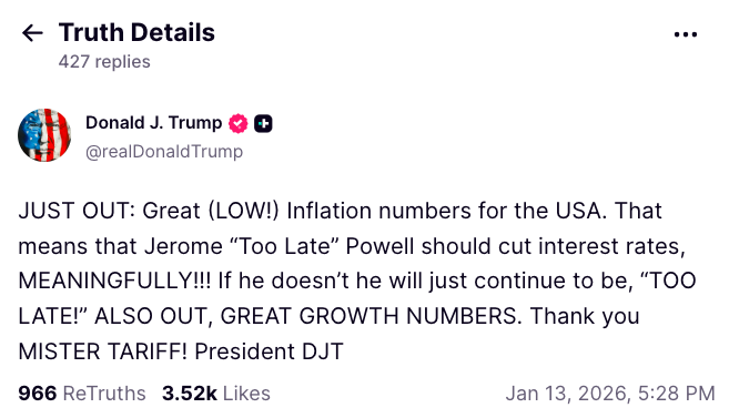 After CPI, Trump reiterated his request for lower rates — something that would notionally have a positive impact on liquidity flowing into risk assets and crypto.