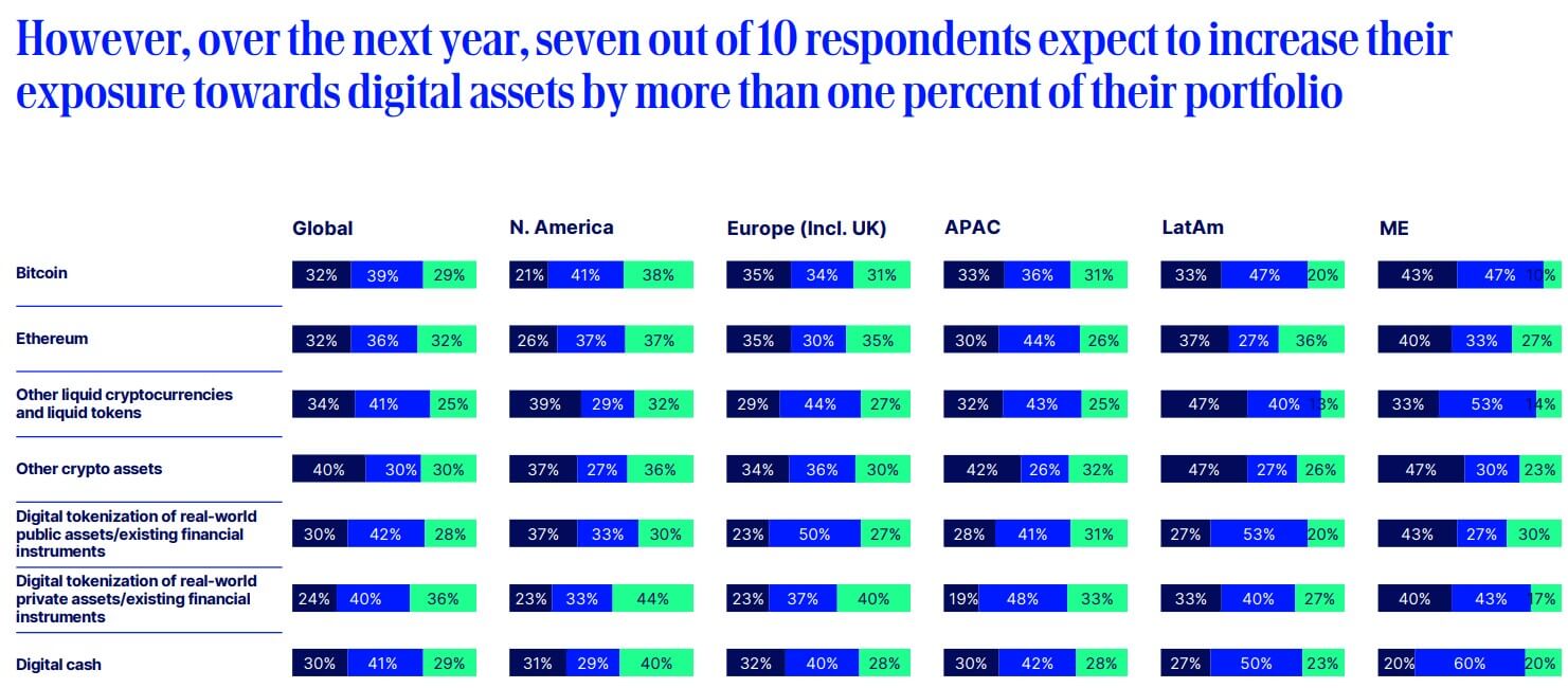 Average portfolio allocations across digital assets are 7%, with target allocations expected to reach 16% within three years.
