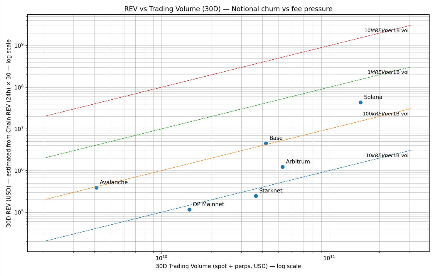 Starknet generates roughly $250,000 in monthly REV against $36.6 billion in trading volume, while Solana produces over $30 million in REV.