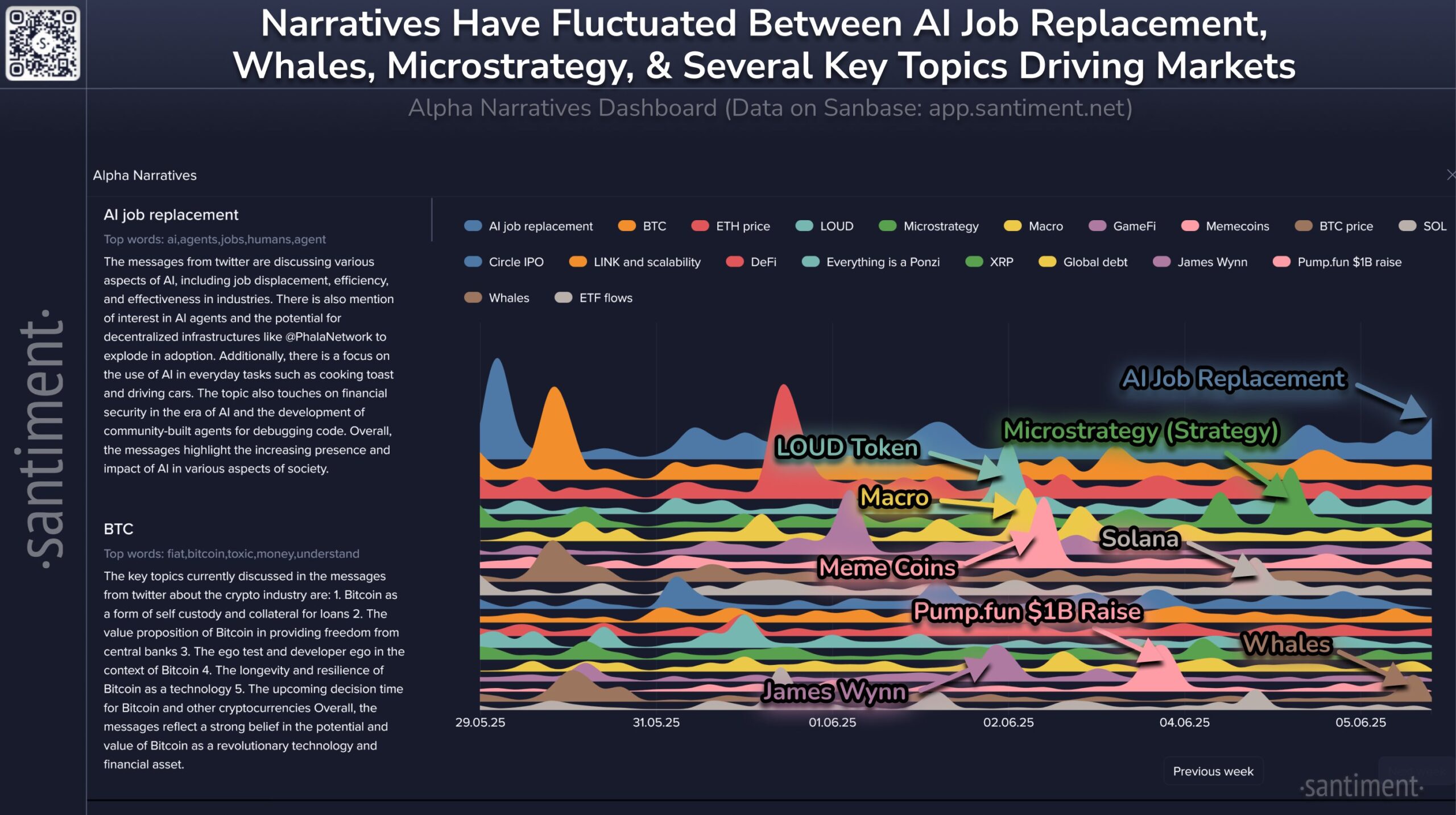 AI job replacement was a top discussion ahead of memecoins and Strategy. Source: Santiment