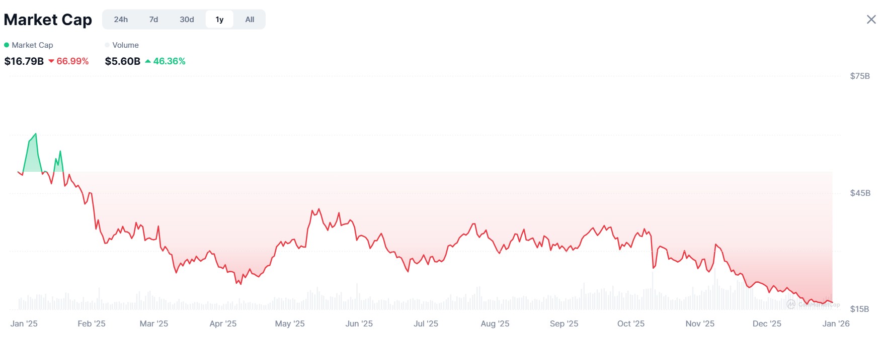 AI tokens boomed in late 2024 but have since lost about 67% of their market value. Source: CoinMarketCap