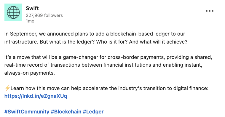 SWIFT’s post on LinkedIn in December 2025. Source: SWIFT