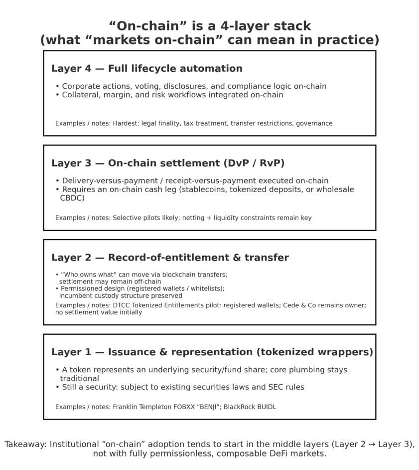 The answer requires precision. “On-chain” isn’t a single thing: it is a four-layer stack, and most of what Atkins described sits in the middle layers, not the DeFi-native endpoints that crypto Twitter imagines.