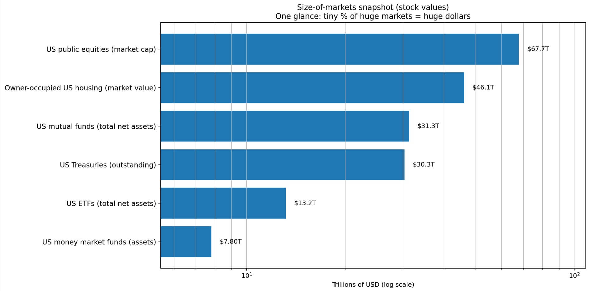 Fund shares represent a different entry point. Money market funds hold $7.8 trillion in assets as of early January 2026. Mutual funds have $31.3 trillion, and ETFs hold $13.17 trillion.