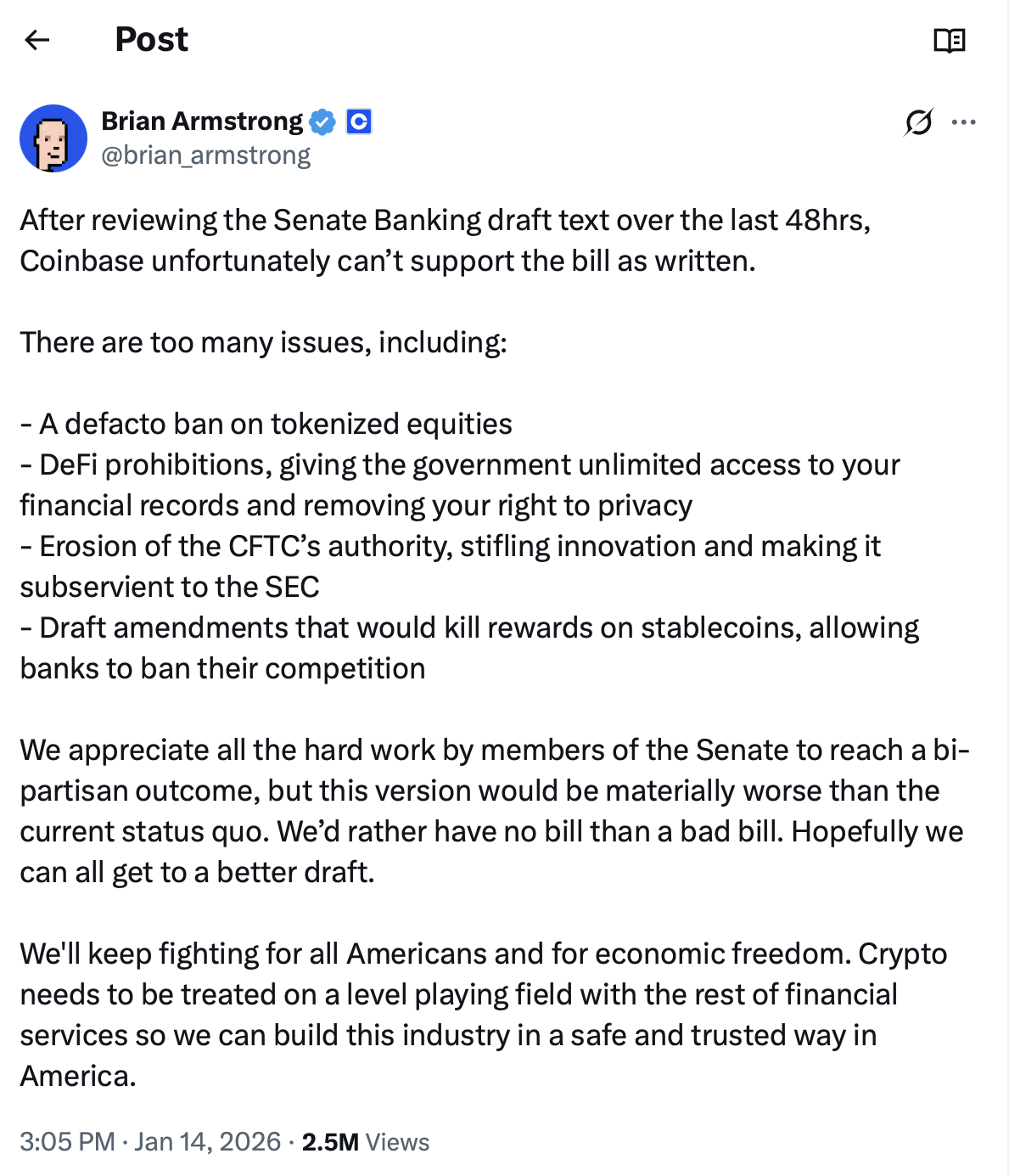 He added that Coinbase would “rather have no bill than a bad bill” if the legislation advances in its current form.