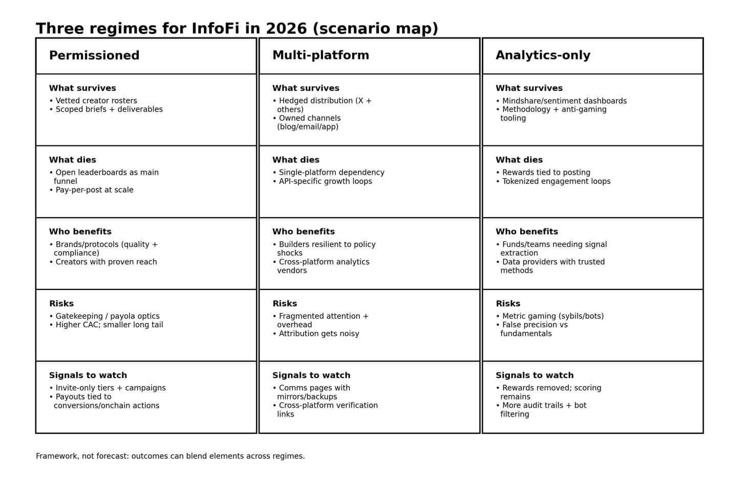 The forward trajectory for InfoFi splits into three plausible regimes.