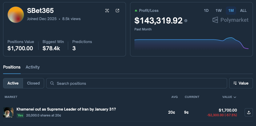The remaining wallet, “SBet365,” placed another bet two days ago, predicting that Iran’s Supreme Leader Ayatollah Ali Khamenei would be ousted by Jan. 31, Lookonchain noted.