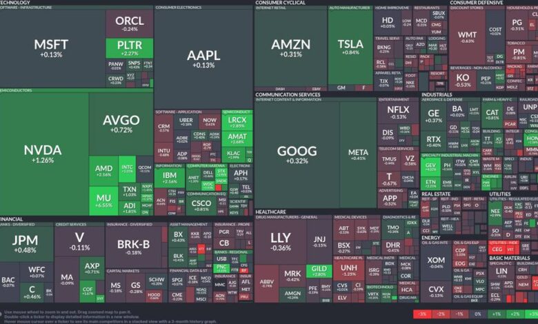 The current market mood is largely bullish, especially within tech-driven sectors. The positive momentum in technology and semiconductors aligns with optimistic investor sentiment regarding innovations and demand in these industries. However, the decline in healthcare stocks indicates caution among investors regarding healthcare policy changes and economic impacts.