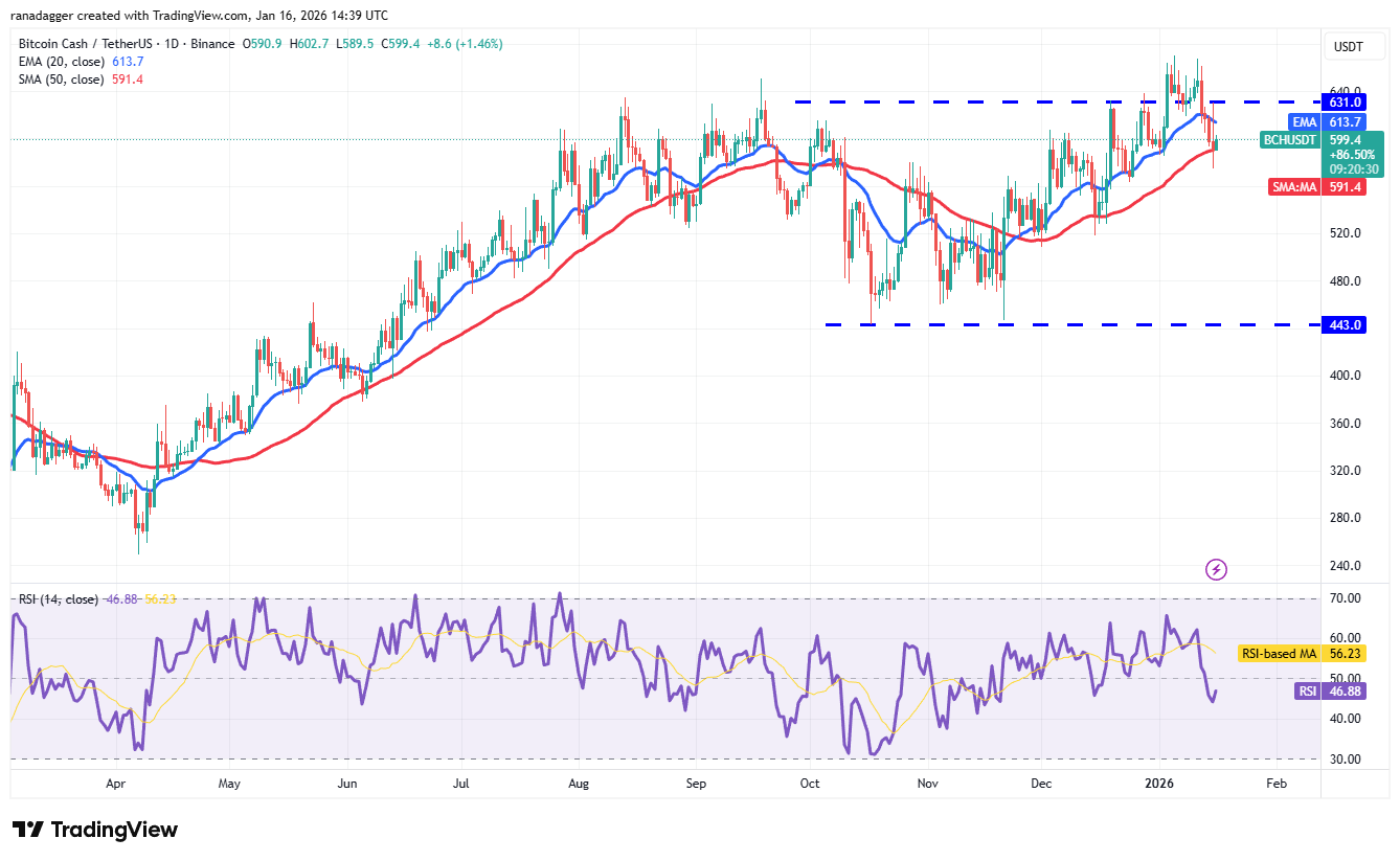 The 20-day EMA ($613) has started to turn down, and the RSI is in the negative territory, indicating a slight edge to the sellers. If the price sustains below the 50-day SMA ($591), the BCH/USDT pair could slump to $563 and then to $518.