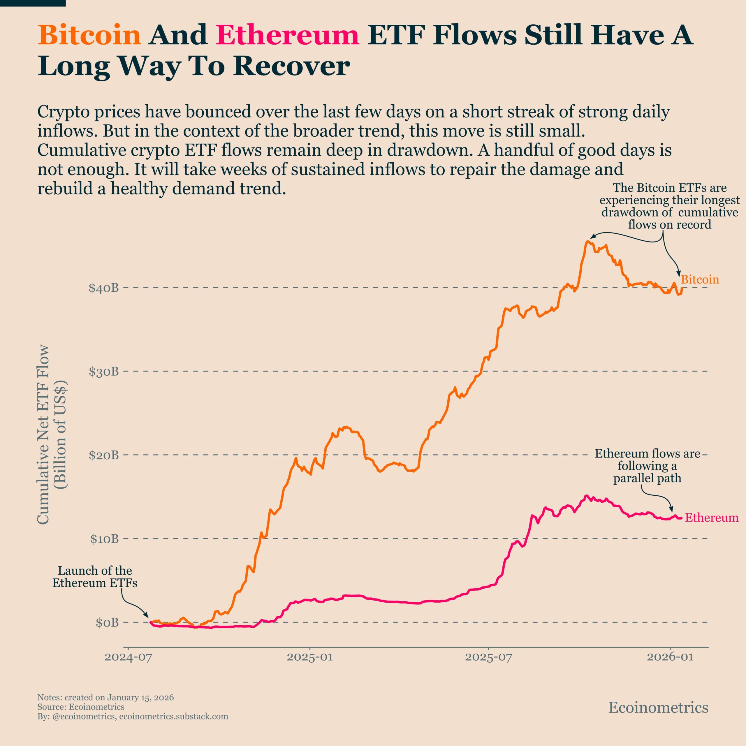 According to the Bitcoin macro intelligence newsletter, Ecoinometrics, short bursts of ETF inflows have repeatedly led to brief price bounces followed by fading momentum.