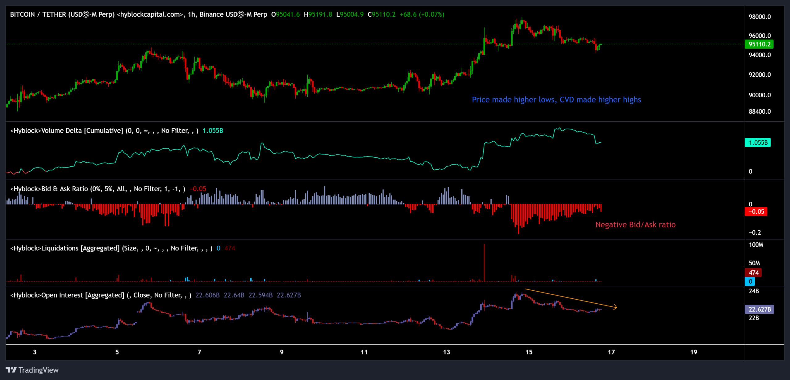 At the same time, the bid–ask ratio stayed negative throughout the rally, meaning sell orders continued to outweigh bids even as the price moved up, a sign that buyers were lifting offers rather than building passive support.