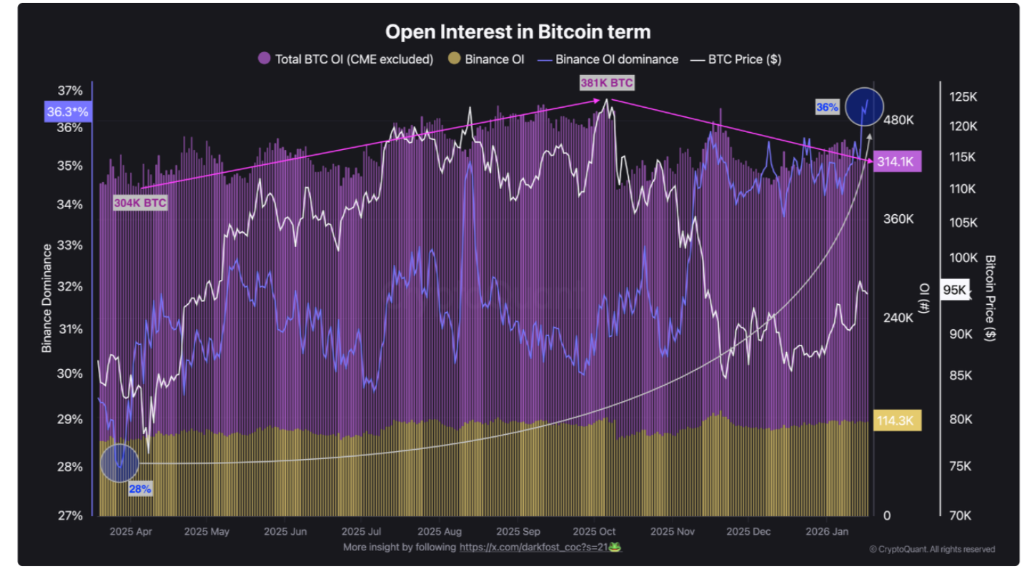 CryptoQuant notes that overall open interest (OI) on derivatives has dropped by nearly 17.5% since then in BTC terms.
