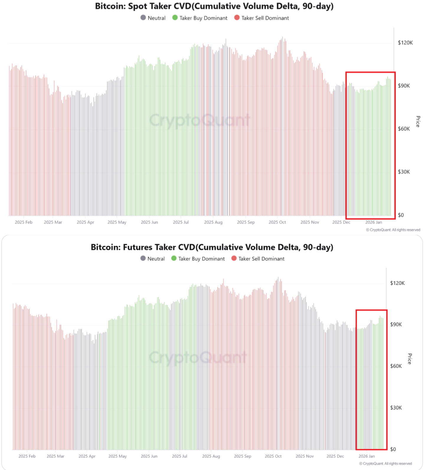 “Spot Taker CVD shifted clearly from sell-dominant to buy-dominant first, and futures Taker CVD followed this trend afterward,” CryptoQuant continued.