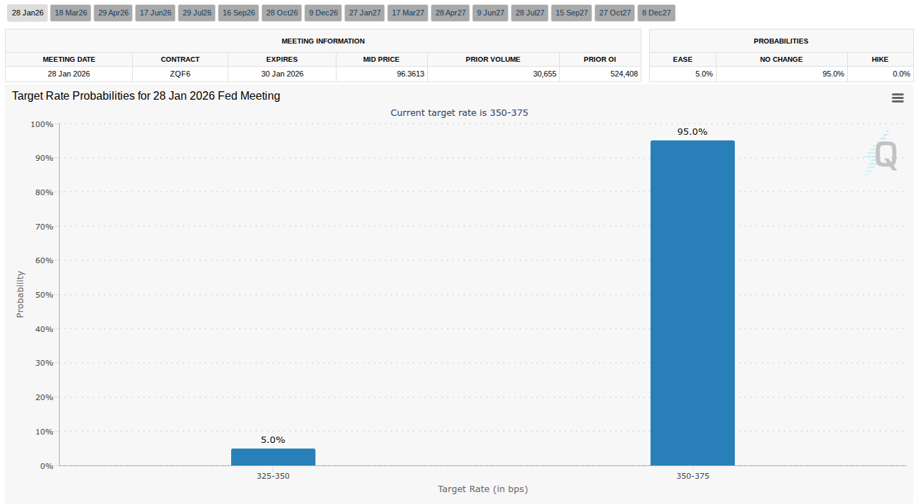 The Fed, meanwhile, is still seen holding interest rates at current levels at its January meeting, providing no liquidity relief for crypto and risk assets.