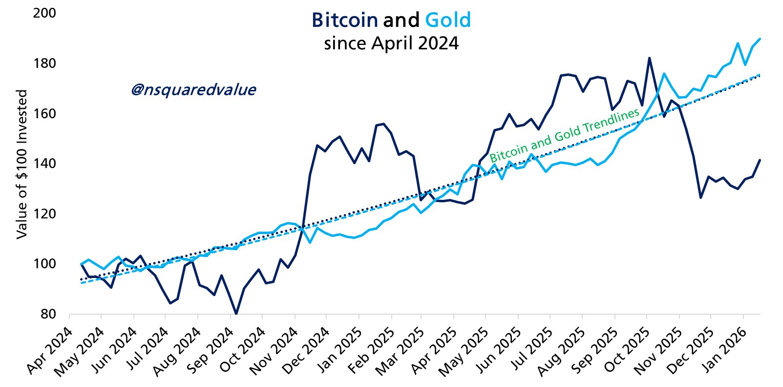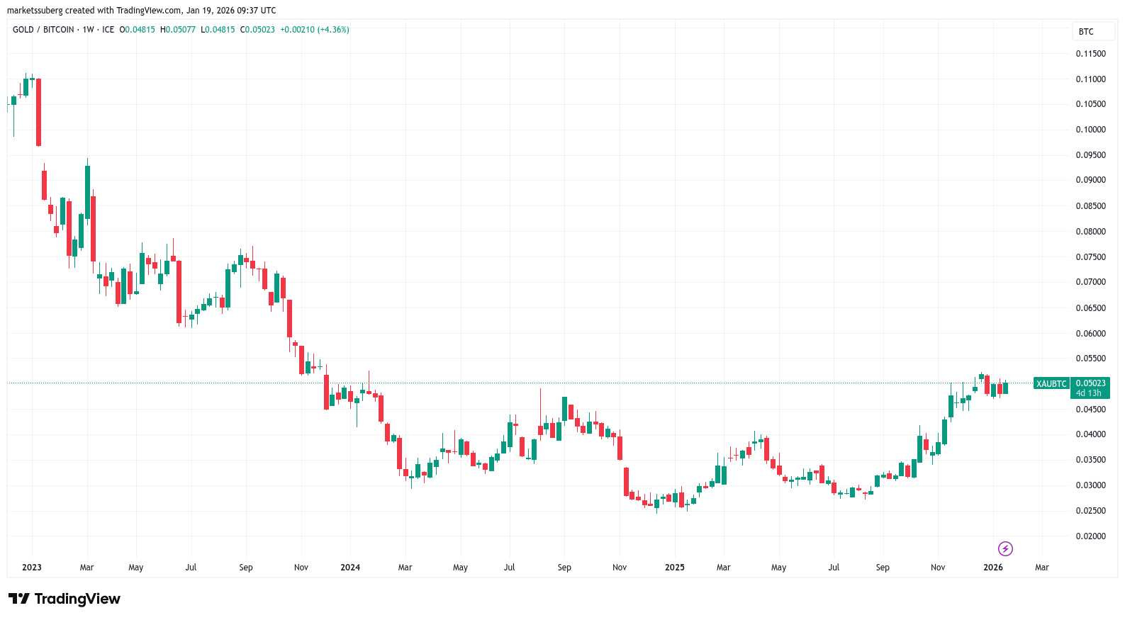 Against Bitcoin, gold remains just shy of two-year highs, having almost doubled in BTC terms since August 2025.