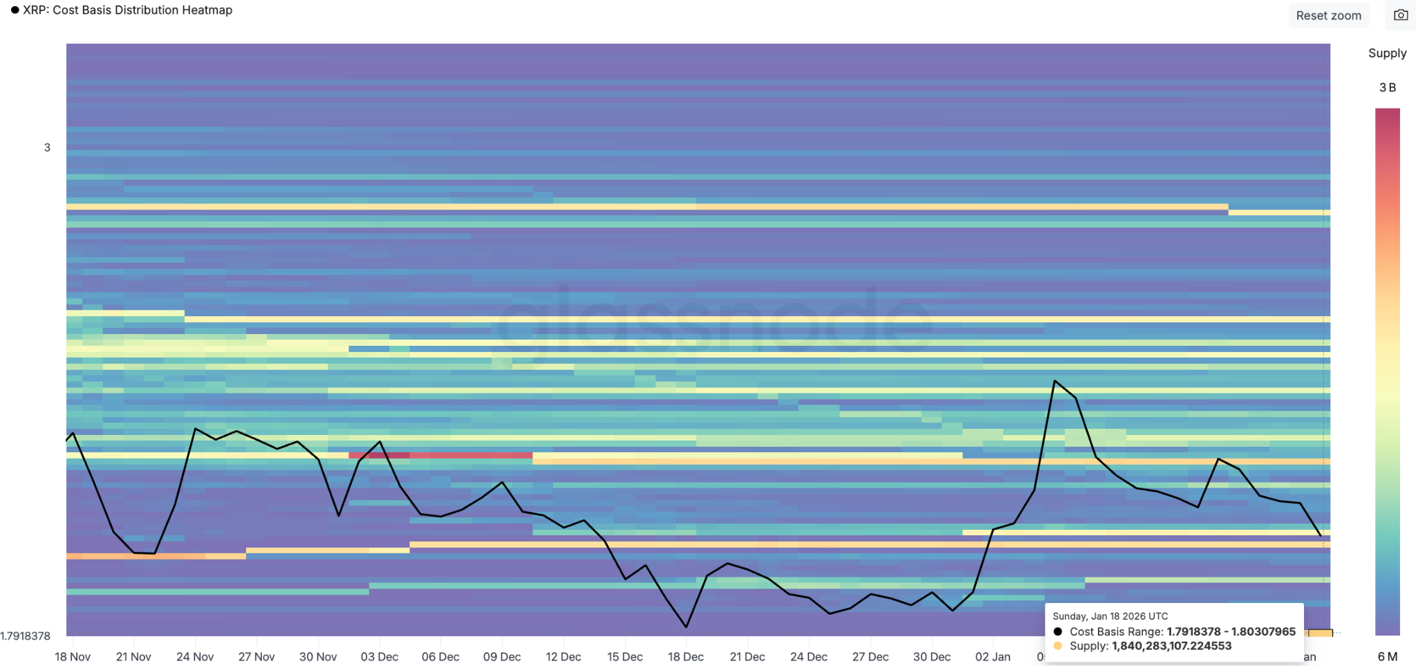 The cost basis distribution heatmap reveals that more than 1.78 billion XRP were bought around this level over the last six months. The next significant support sits at $1.78 and $1.80, where investors acquired approximately 1.84 billion XRP.
