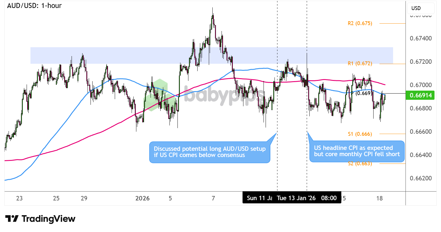 Core CPI did come in softer, briefly pressuring the dollar and lifting AUD/USD toward .6725. That move ran against the setup, as the CPI surprise triggered risk-on flows instead of the risk-off environment we were looking for.