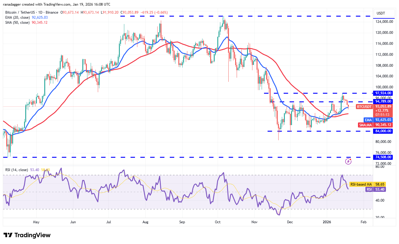 BTC’s pullback has reached the 20-day EMA ($92,625), which is a critical near-term support to watch out for.