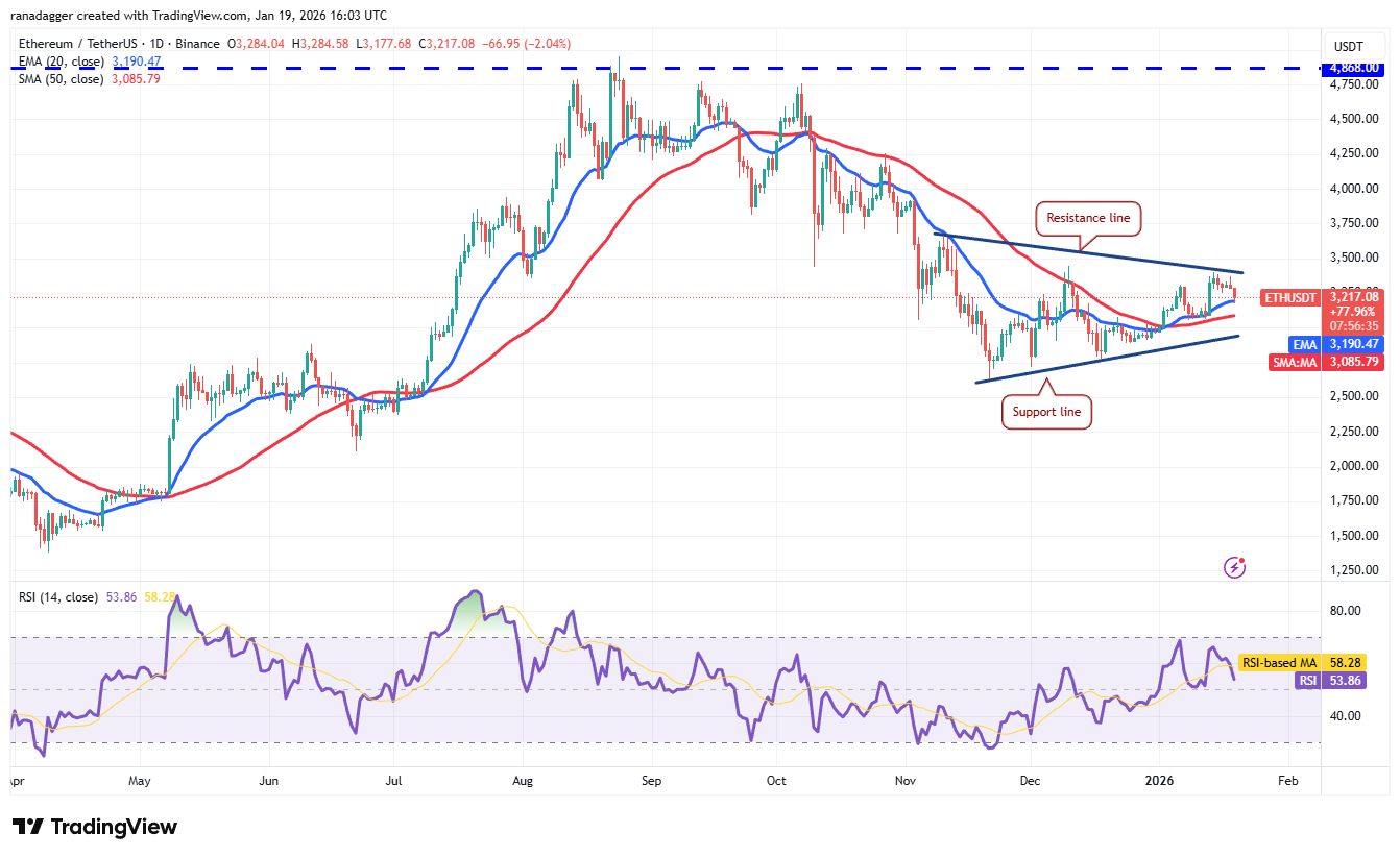The slightly upsloping 20-day EMA ($3,190) and the RSI near the midpoint do not indicate a clear advantage either to the bulls or the bears. If the price closes below the 20-day EMA, the ETH/USDT pair may extend its stay inside the triangle.